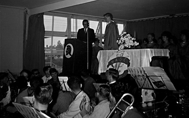 OHS Principal Emile Mika and James Cullington (maybe) in an assembly for the National Honor Society. 63-64.